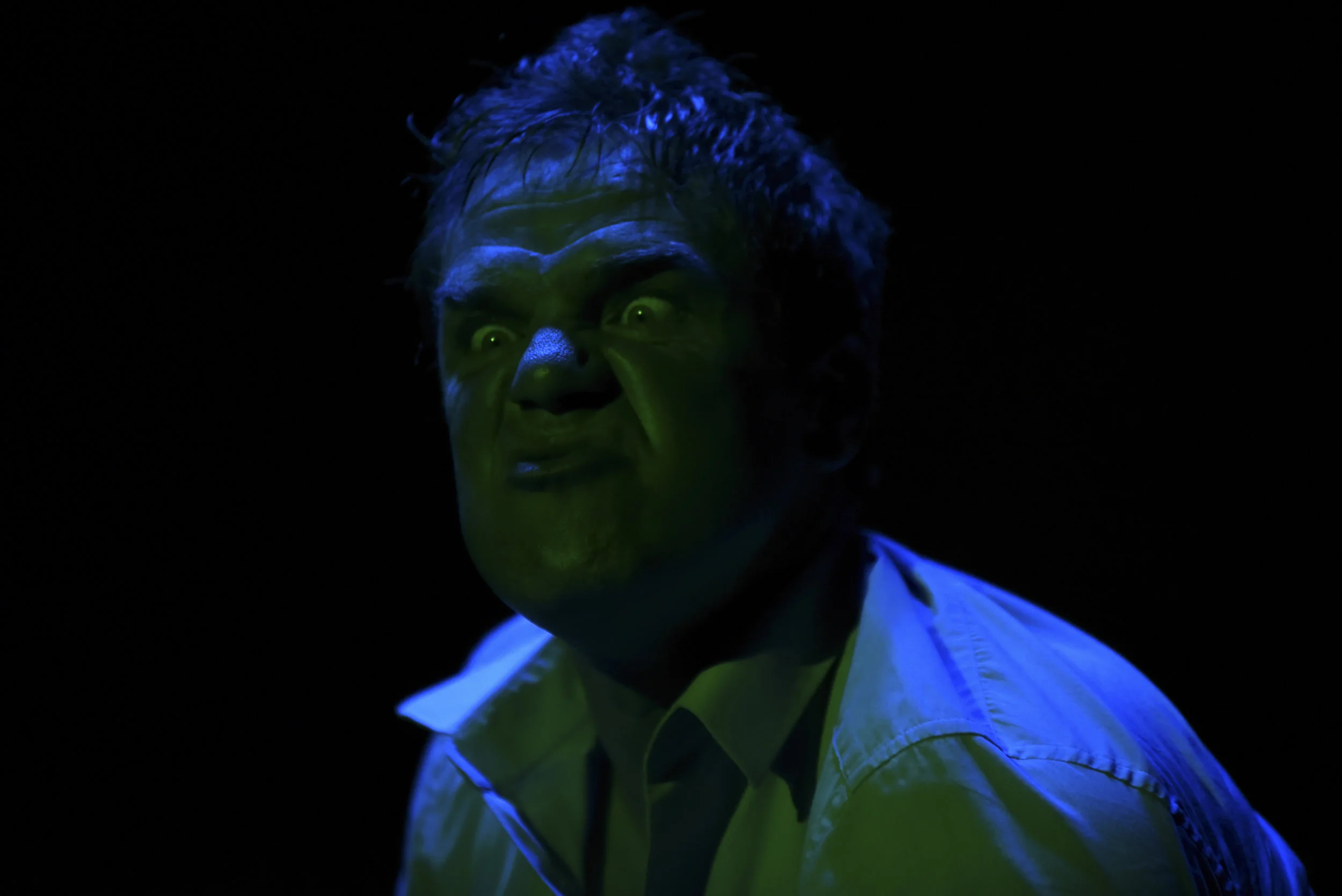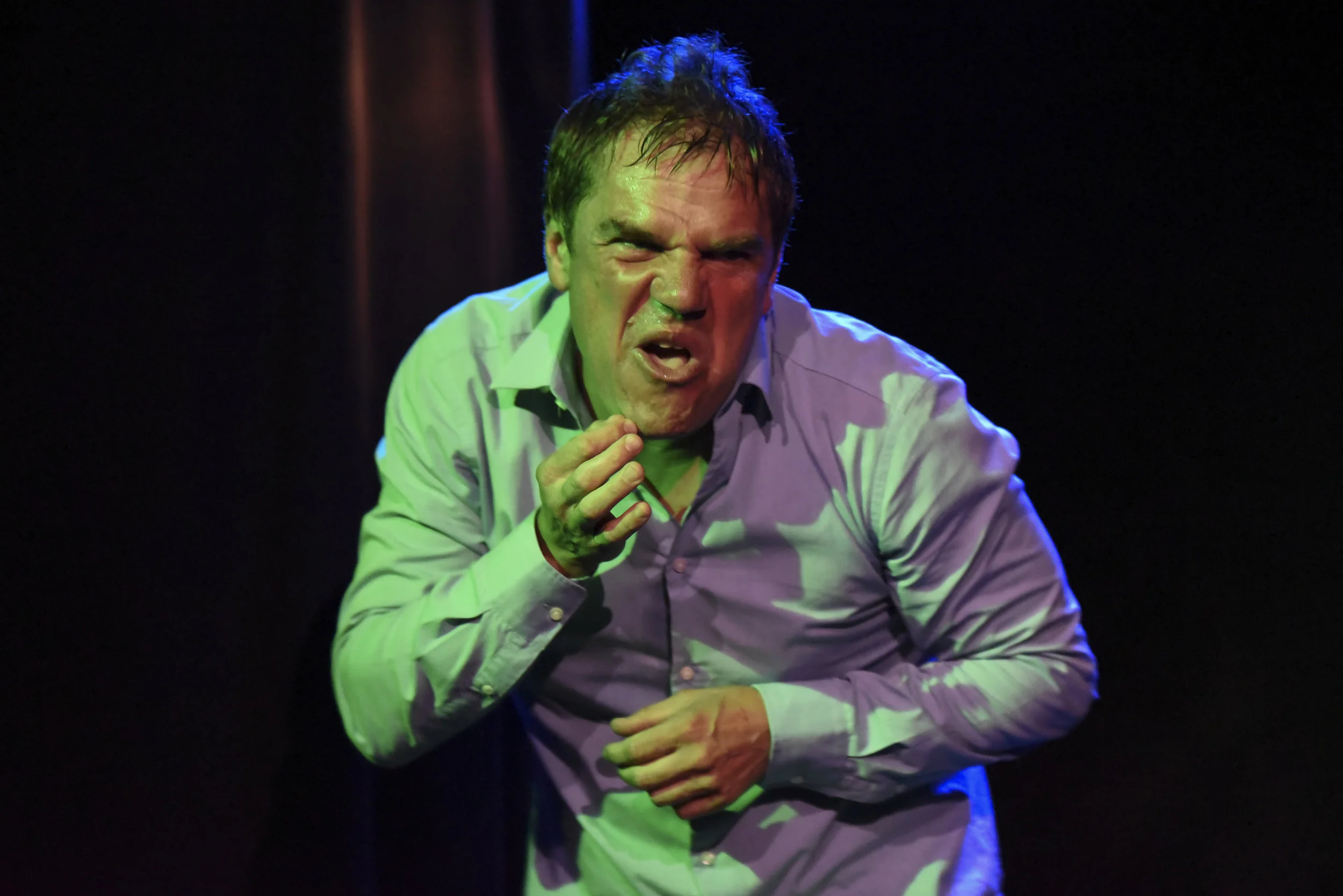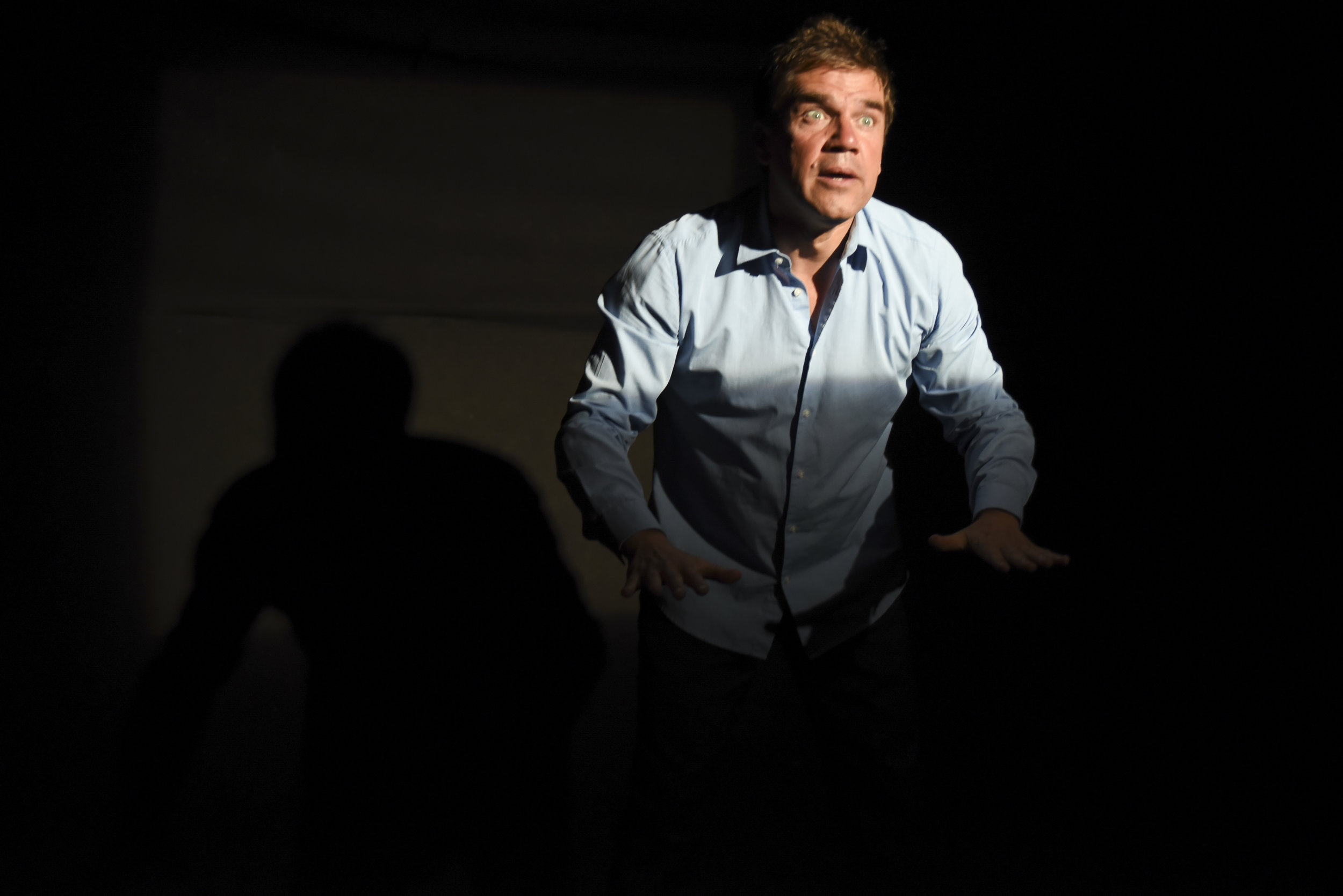 Sans décor, ni artifice, Cédric Ingard nous transporte dans son univers. De grimaces en onomatopées, son visage et même son corps tout entier se transforment. Un jeu d’acteur qui force le respect, mis en espace par celui de la lumière. Sous la direction de Jean Grison, elle détermine les changements spatio-temporels et guide le public dans les ellipses, flashbacks et moments oniriques. Avec Jean-Michel Péril, la direction artistique est très précise dans la conduite du comédien et le découpage de la pièce est quasi cinématographique, comme un récit non linéaire pour mieux suivre le tourbillon des pensées du héros.